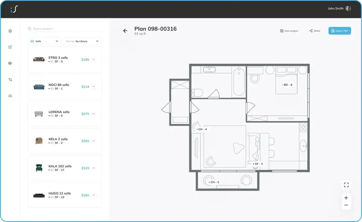 An interactive HTML5 property visualisation tool which enables to visualize the possibilities for renovation and changes in the interiors of real estate available for purchase or lease.